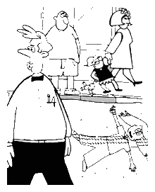 Finally, the guy behind me cracked. He must have thought the real John Lennon had been exhumed for today's performance, he was so anxious. He kept inching closer to the rear of my car until I could see every last detail of his sourpuss face. I think he wanted me to run the little girl over. And if I didn't have the guts, he'd plow me through himself. I, of course, was afraid of being vaporized by the Enchanted Crosswalk of Sumac Park. The cars behind him started to "lose it" as well until we became one big mass of angry metal.
