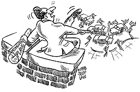Building a parking lot in the middle of a shopping center is like... like... building a parking lot in the middle of a shopping center. The only thing more dangerous would be to put the mall on the center divider of the freeway and have people slow down to a survivable speed and roll out of their cars to go shopping. I concluded that the Promenade was designed by a guy who, every Friday night, sits up in one of those bell towers, sipping a beer and laughing like there's nothing funnier in the whole wide world. And you know what... he may be right. |